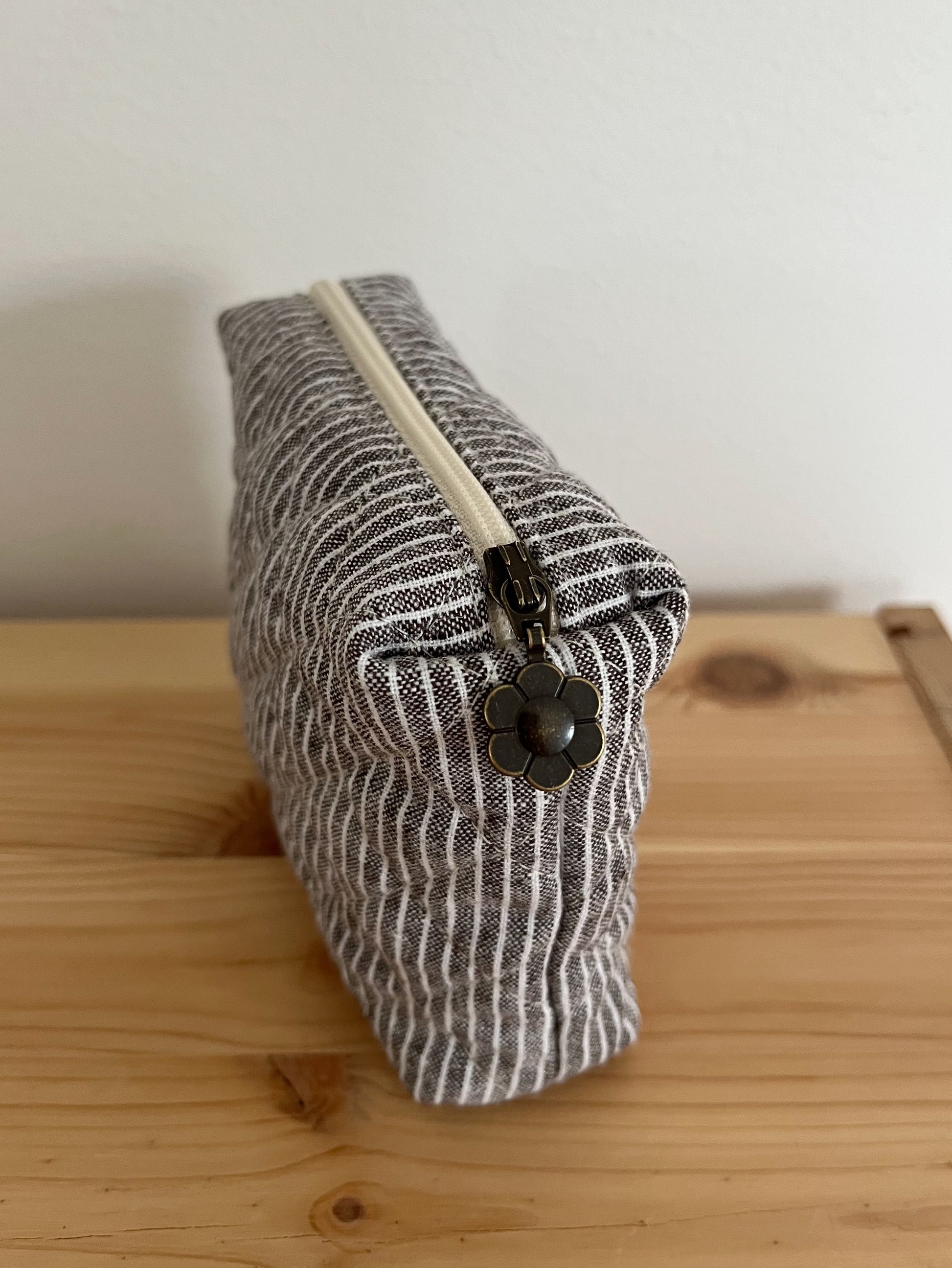Denna charmiga necessär är tillverkad av vackert randigt bomulls/linne tyg. Den quiltade designen ger både mjukhet och struktur, perfekt för att organisera allt från smink och hudvård till små vardagsprylar. Oavsett om du är hemma eller på resande fot är den här necessären en stilsäker och praktisk följeslagare. Finns i flera storlekar för att passa just dina behov.