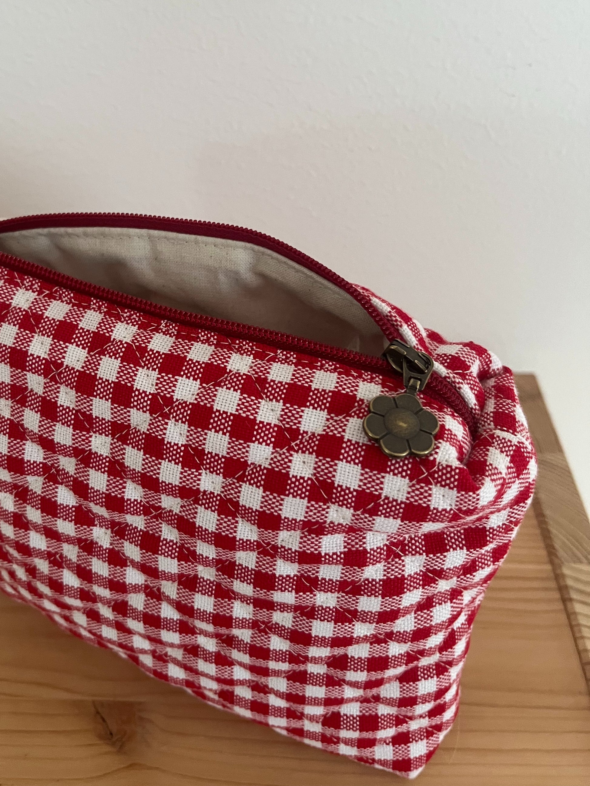Denna charmiga necessär är tillverkad av fint rött rutigt bomullstyg. Den quiltade designen ger både mjukhet och struktur, perfekt för att organisera allt från smink och hudvård till små vardagsprylar. Oavsett om du är hemma eller på resande fot är den här necessären en stilsäker och praktisk följeslagare. Finns i flera storlekar för att passa just dina behov.