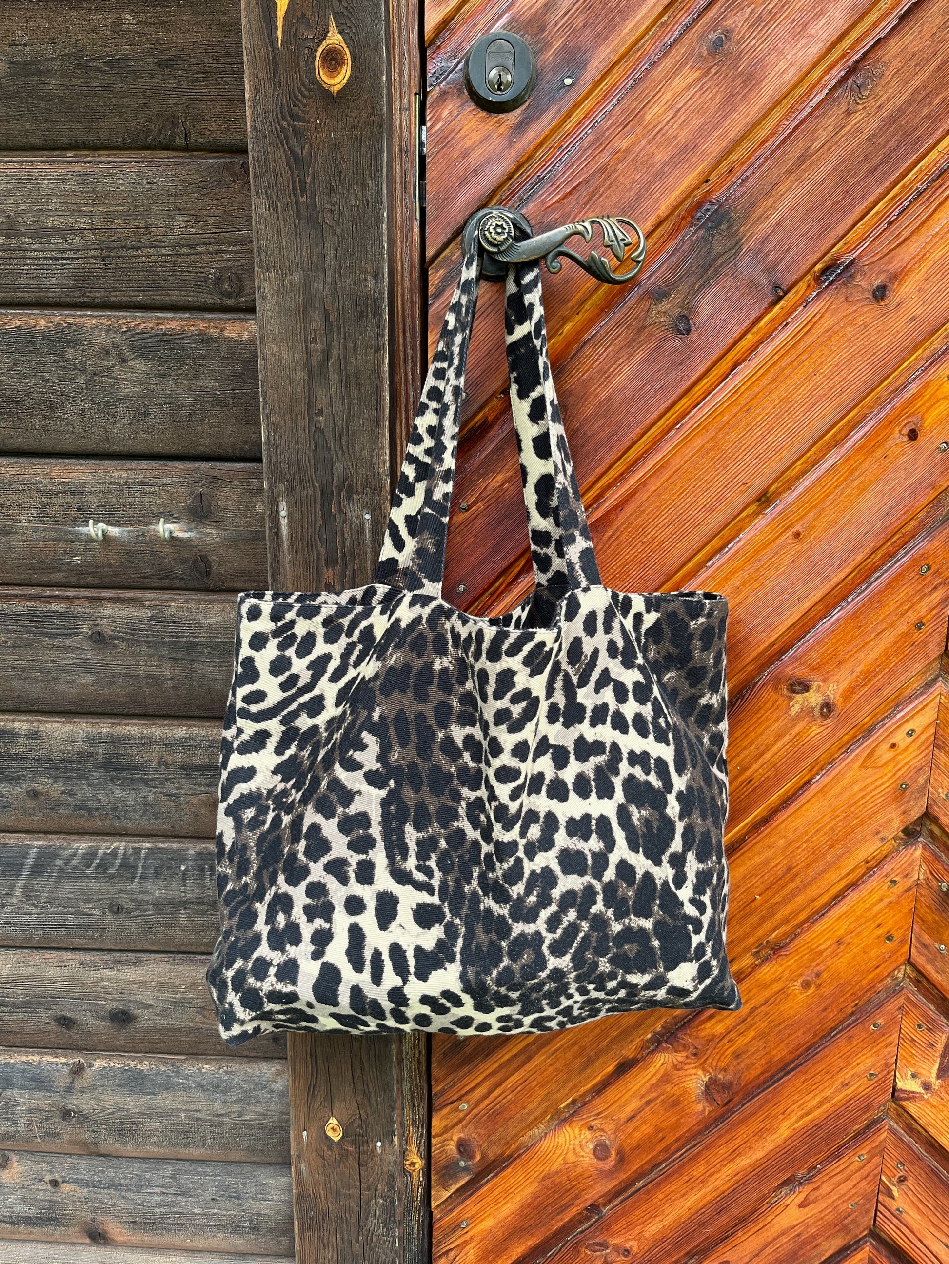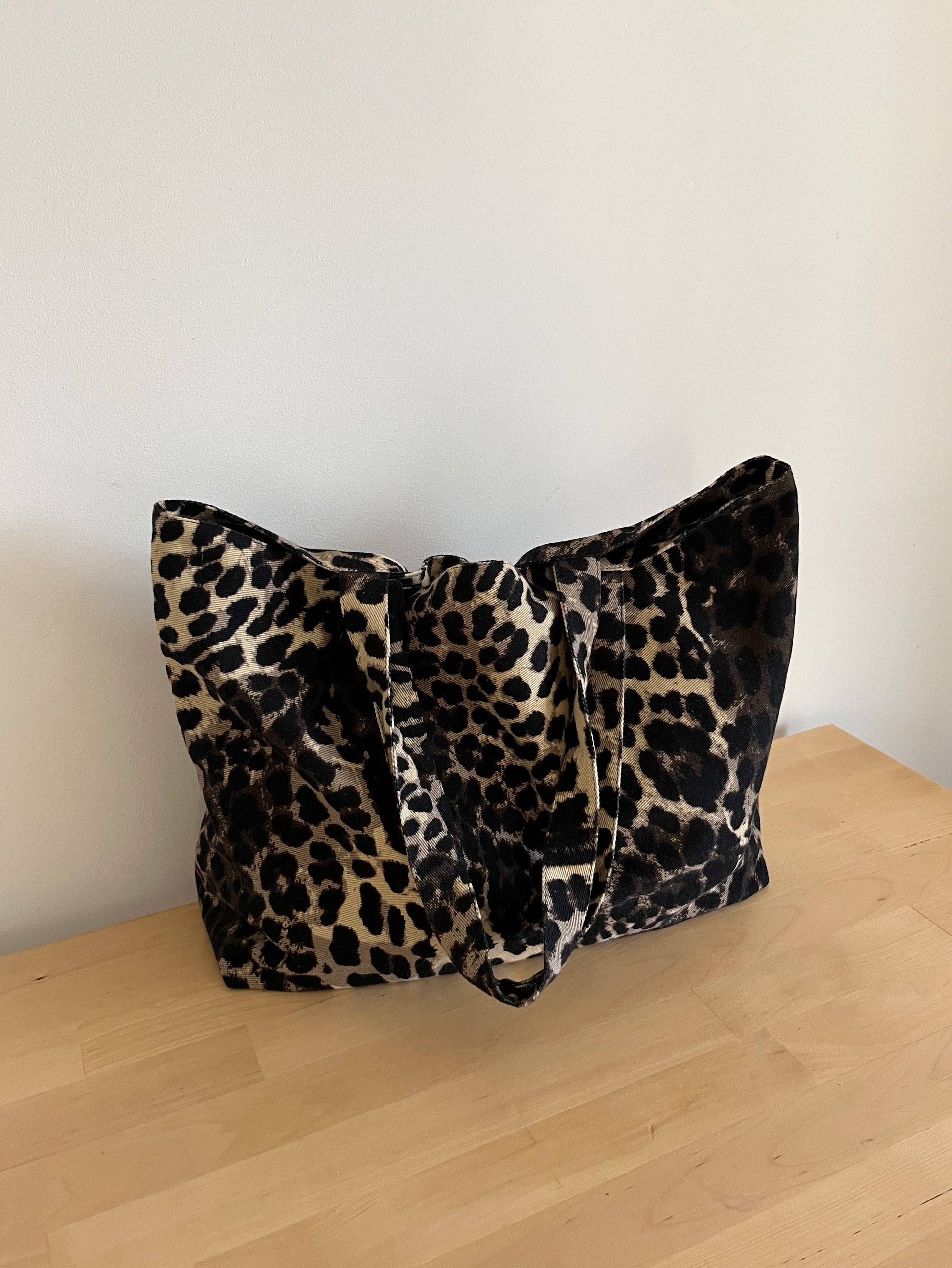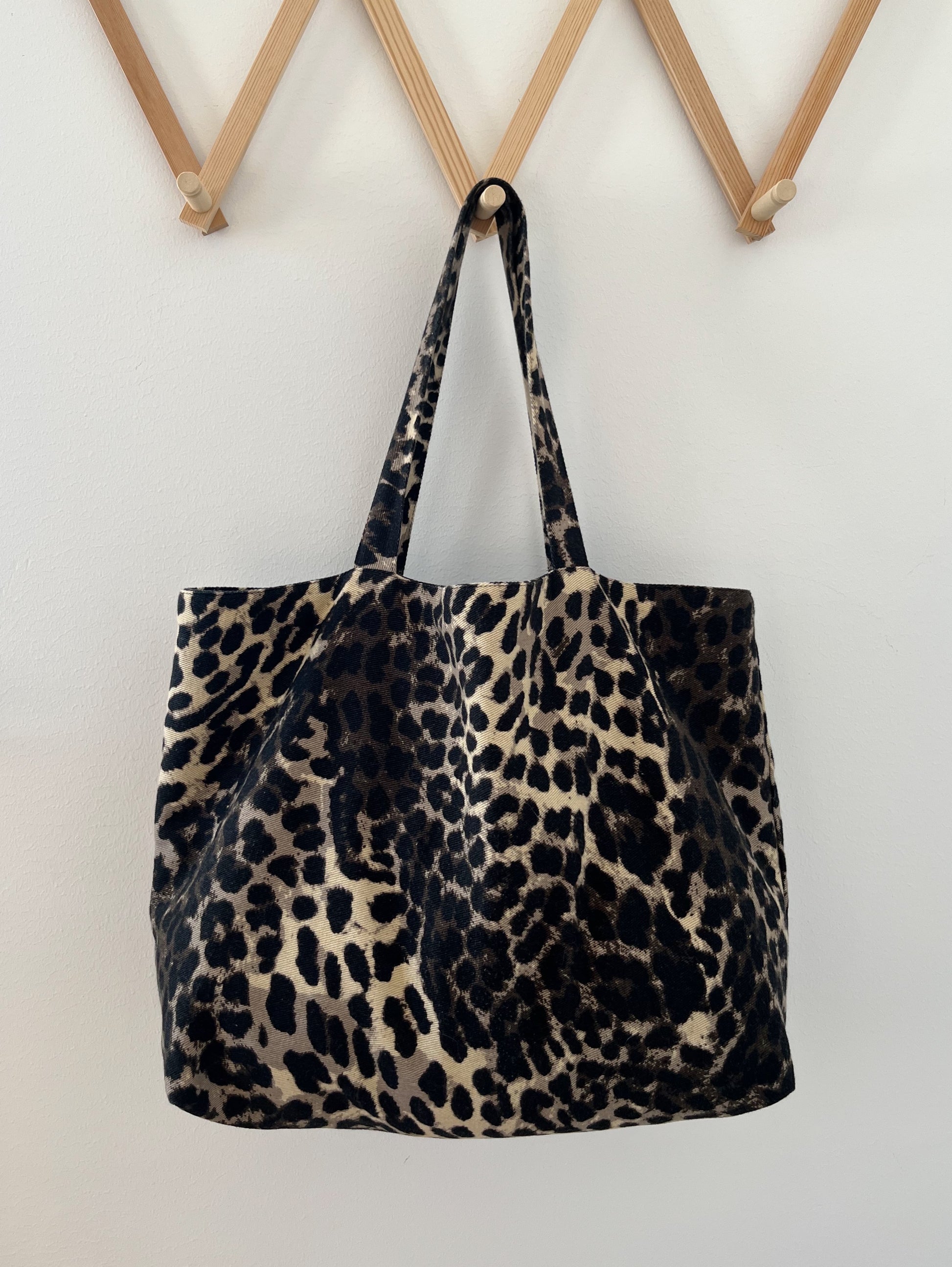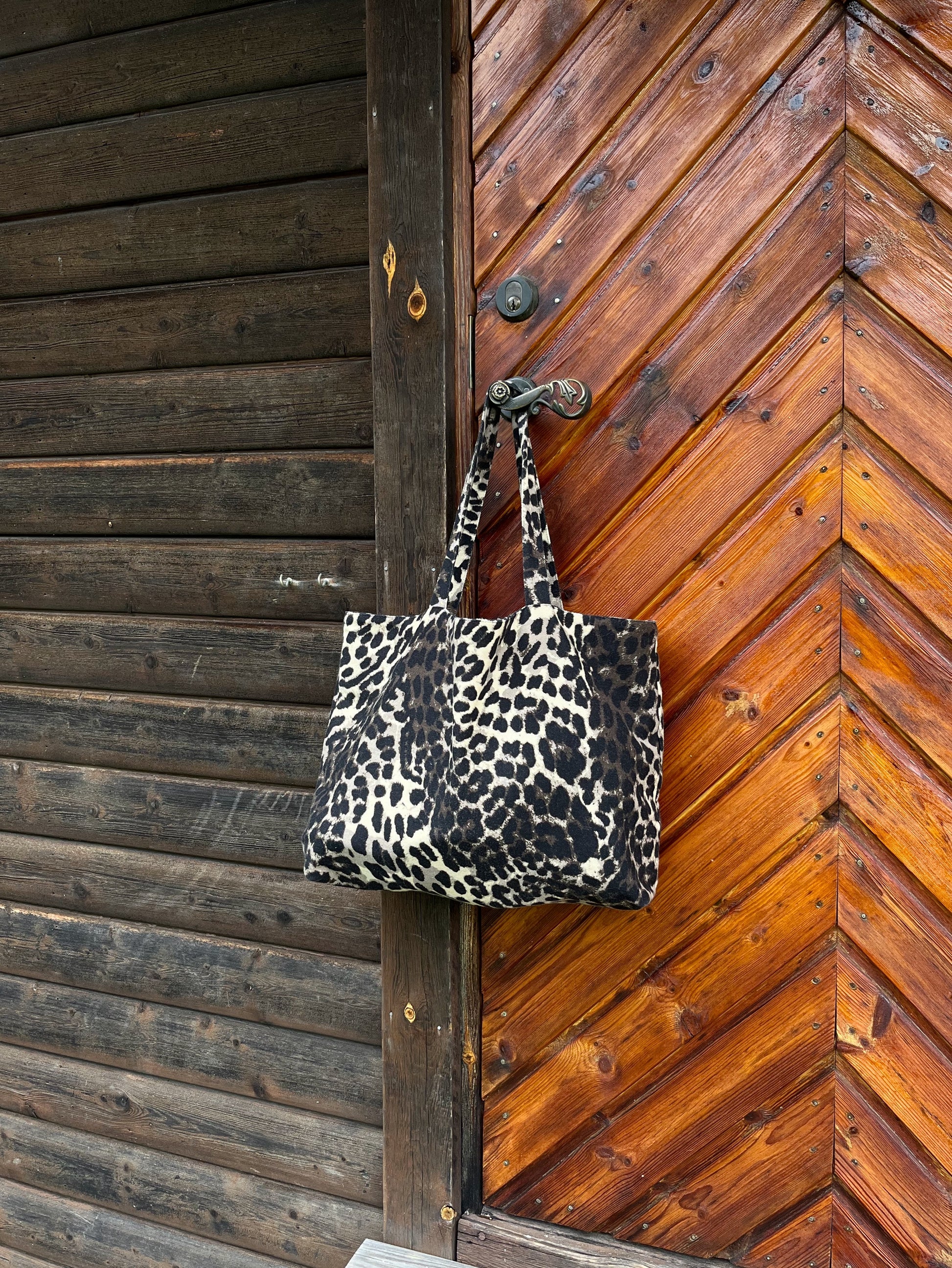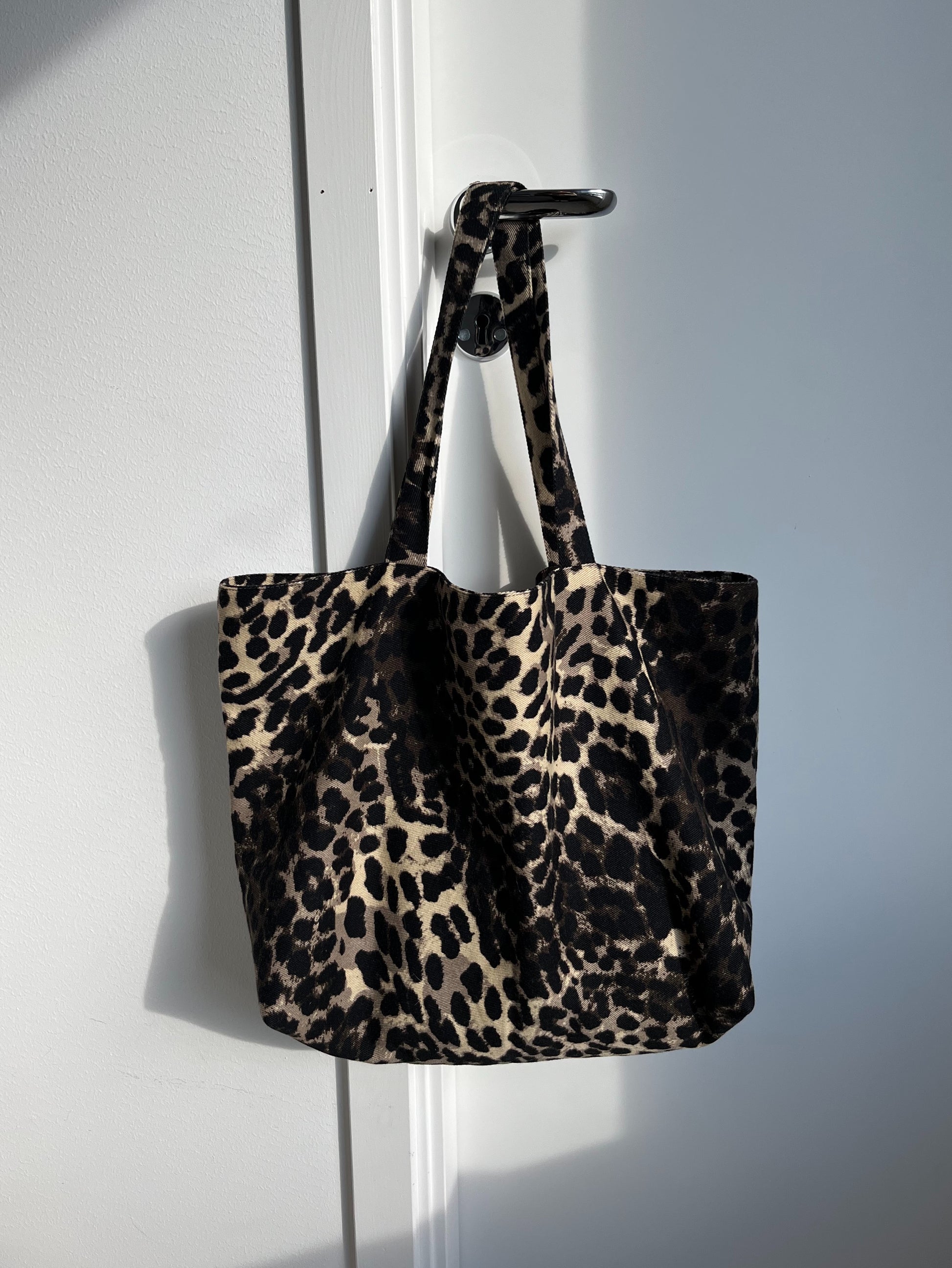Klassisk handgjord tote bag i leopardtyg. Fin men framförallt rymlig och praktiskt. Den lilla modellen är perfekt till vardags för matlådan eller annat smått och gott och den stora är perfekt att ha med till stranden, när du ska på weekend eller bara som en stor vardagsväska. Tyget är kraftigt och 100% bomull vilket gör väskan robust men också mjuk och hållbar.